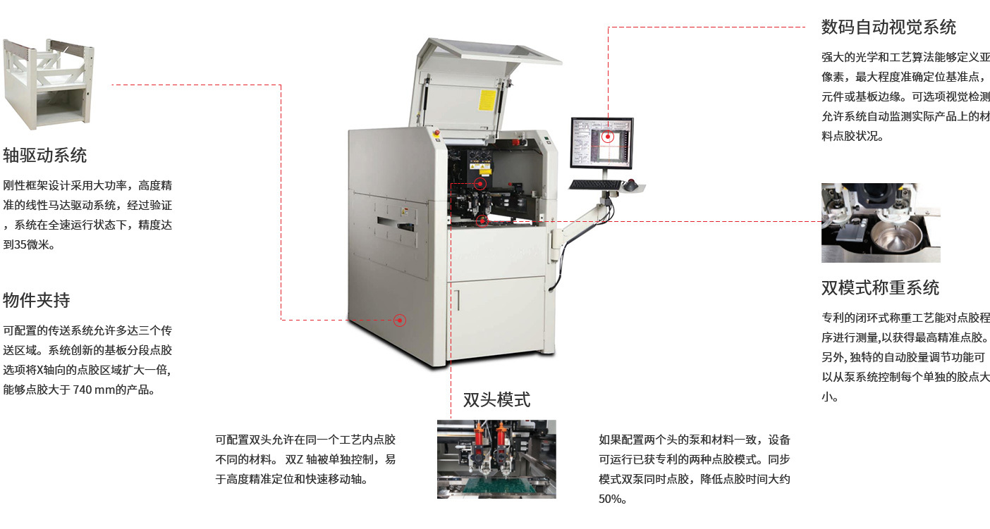 Prodigy 專為高速、高精度的點膠而設計和打造。Camalot 工程師們憑借超過 20 年在線性馬達和先進的運動控制系統方面取得的經驗,使加速度峰值達到 1.5g。 最先進的 XY軸驅動系統是新一代點膠的關鍵點。創新的剛性框架設計融合了先進的線性驅動結構使點到點的移動迅速,高精準和長期的可重復性。